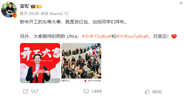 此前有数码博主爆料称,小米AI眼镜已获得入网许可。同时,近日有消息称,小米将会在2月份的发布会上推出AI眼镜产品。该产品将由山东某AR/VR领域龙头企业独家代工,欧博这家企业同时也是AR/VR/AI眼镜品牌Meta的供应商。 而小米创办人、董事长兼CEO雷军日前预告,小米15 Ultra和小米SU7 Ultra将在本月底发布。小米这三款产品或将同台亮相。