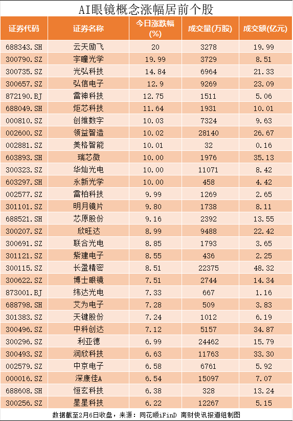 实际上,早在去年11月,已有小米进军AI眼镜行业、入局“百镜大战”的市场传闻。 彼时有消息称,小米正计划推出新一代AI眼镜,数月前已与歌尔股份(002241.SZ)合作,该产品预计于2025年Q2(大概率是4月份的米粉节)发布。对于这款产品的出货量,雷军的预期“在三十万台往上”。 2024年11月13日,欧博娱乐南财快讯记者就此以投资者身份致电歌尔股份,相关人士回应称,公司对具体客户信息及项目内容不予透露。公司AI眼镜业务现阶段尚未量产,主要产品可应用于AI眼镜等终端产品。 行业巨头积极布局 南财快讯记者注意到,除小米外,目前已经有百度、阿里、华为等行业巨头进入到AI眼镜行业,同时业内还有众多新兴公司崛起,如rokid、雷鸟等。 2024年11月,欧博allbet百度已打响国内厂商AI眼镜大战的第一枪。11月12日,在百度世界2024上,百度发布首款眼镜——小度AI眼镜,称该产品为“全球首款搭载中文大模型的原生AI眼镜”,具备第一视角拍摄、边走边问、视听翻译等功能,将于2025年上半年正式上市。 华西证券研报指出,AI眼镜百花齐放,未来市场空间潜力巨大。2025年1月7日,CES 2025大会启幕,各大厂商纷纷入局AI眼镜,除AR初创公司雷鸟、Rokid、李未可等之外,跨界厂商例如电竞品牌雷神科技、显示厂商康冠科技、脑机接口公司LookTech等均有AI眼镜参展。此外,2025年百度、三星、小米等大厂预计均有新款眼镜产品推出,百镜大战一触即发。 AI眼镜概念异军突起 值得注意的是,2月6日,端侧AI概念集体爆发,AI眼镜板块涨幅居前,云天励飞(688343.SH)、瑞芯微(603893.SH)等多股涨停。 同花顺iFinD数据显示,AI眼镜指数今日大涨5.39%,板块内逾10只个股涨停或涨超10%。 据Counterpoint Research预计,随着技术的发展,GenAI将成为中端设备的标准配置,到2028年,超过250美元的智能手机中90%将具备GenAI能力。事实上,国产优秀大模型DeepSeek的出现显著降低了云端侧的训练成本,推理成本降低将加速端侧硬件智能化,AI端侧中AI眼镜、AI手机、AI玩具、AIPC等方向均有望受益。 据Wellsenn预测数据,2025年,传统手机厂商、互联网厂商等将会积极布局、探索AI智能眼镜领域,推动2025年全球AI智能眼镜出货量进一步增长至400万副。 今日,AI眼镜板块迎来大爆发,南财快讯带你一图速览概念股表现↓↓↓