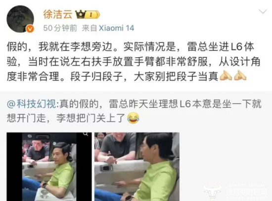 也有网友在公开平台问“真的假的,雷总昨天坐理想L6本意是坐一下就想开门走,李想把门关上了”小米集团副总经理徐洁云回复表示“假的,欧博allbet我就在李想旁边。实际情况是,雷总坐进L6体验,当时在说左右扶手放置手臂都非常舒服,从设计角度非常合理。段子归段子,大家别把段子当真。”据了解,徐洁云统筹小米传播工作,分管集团公关部。